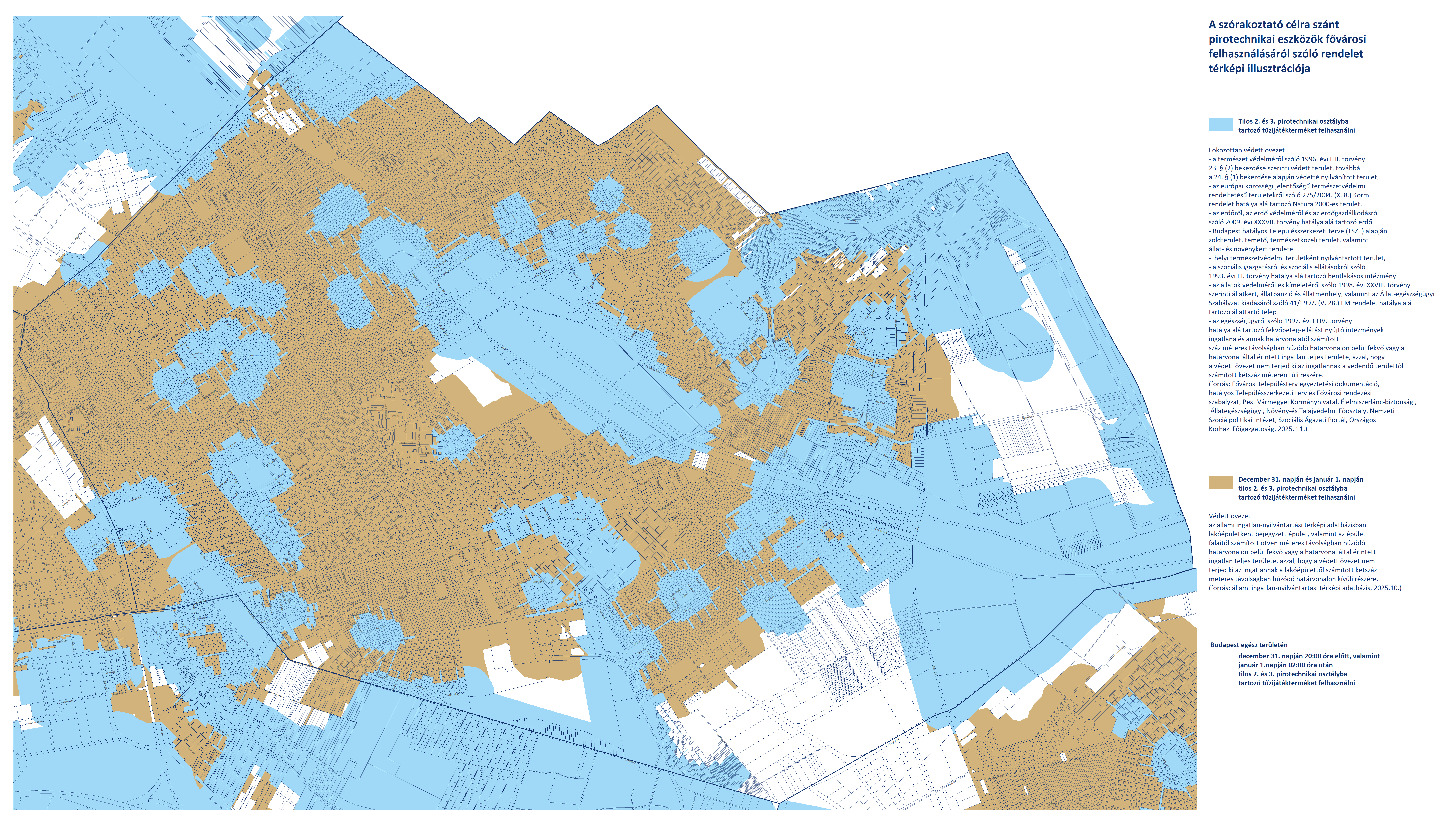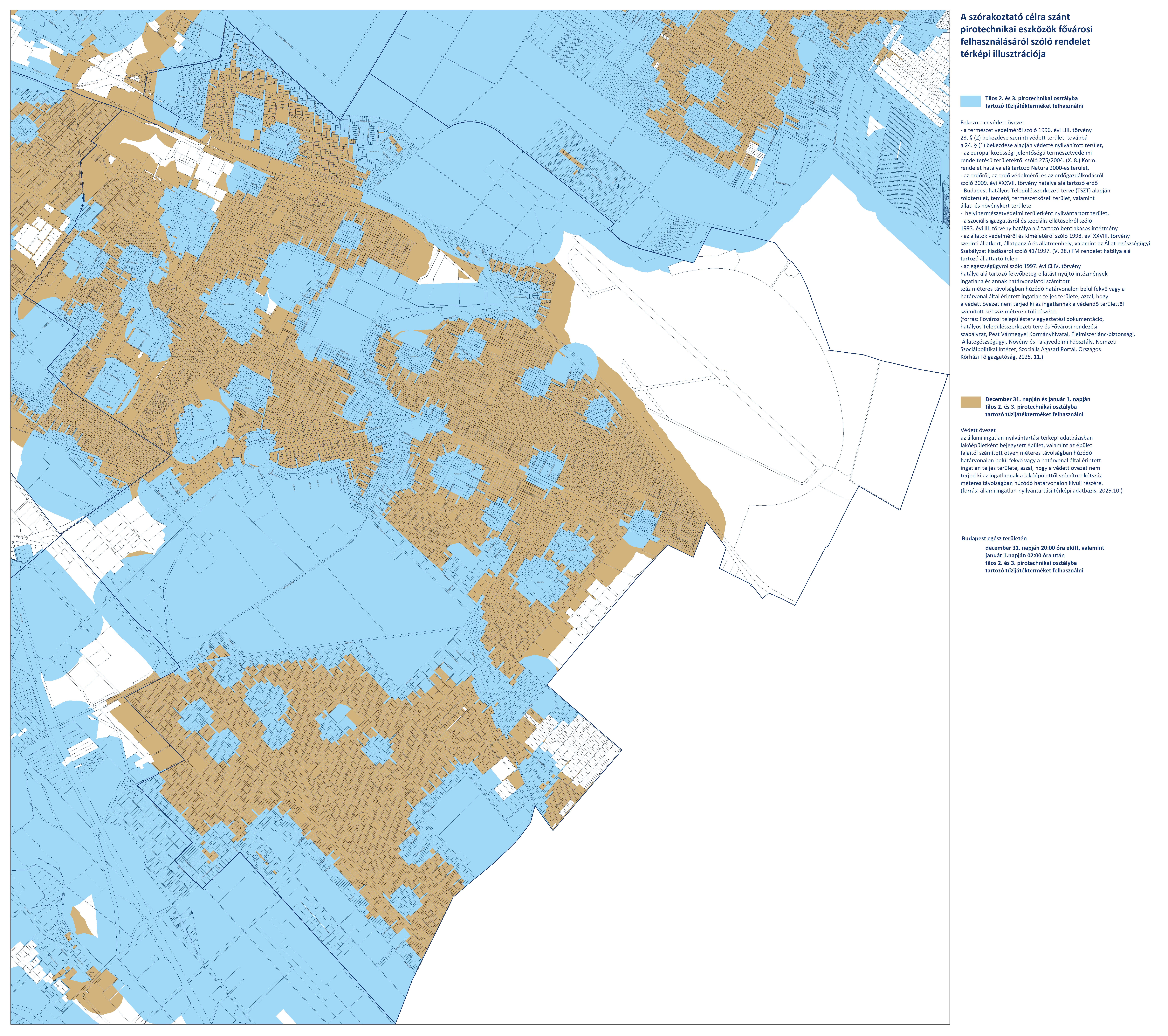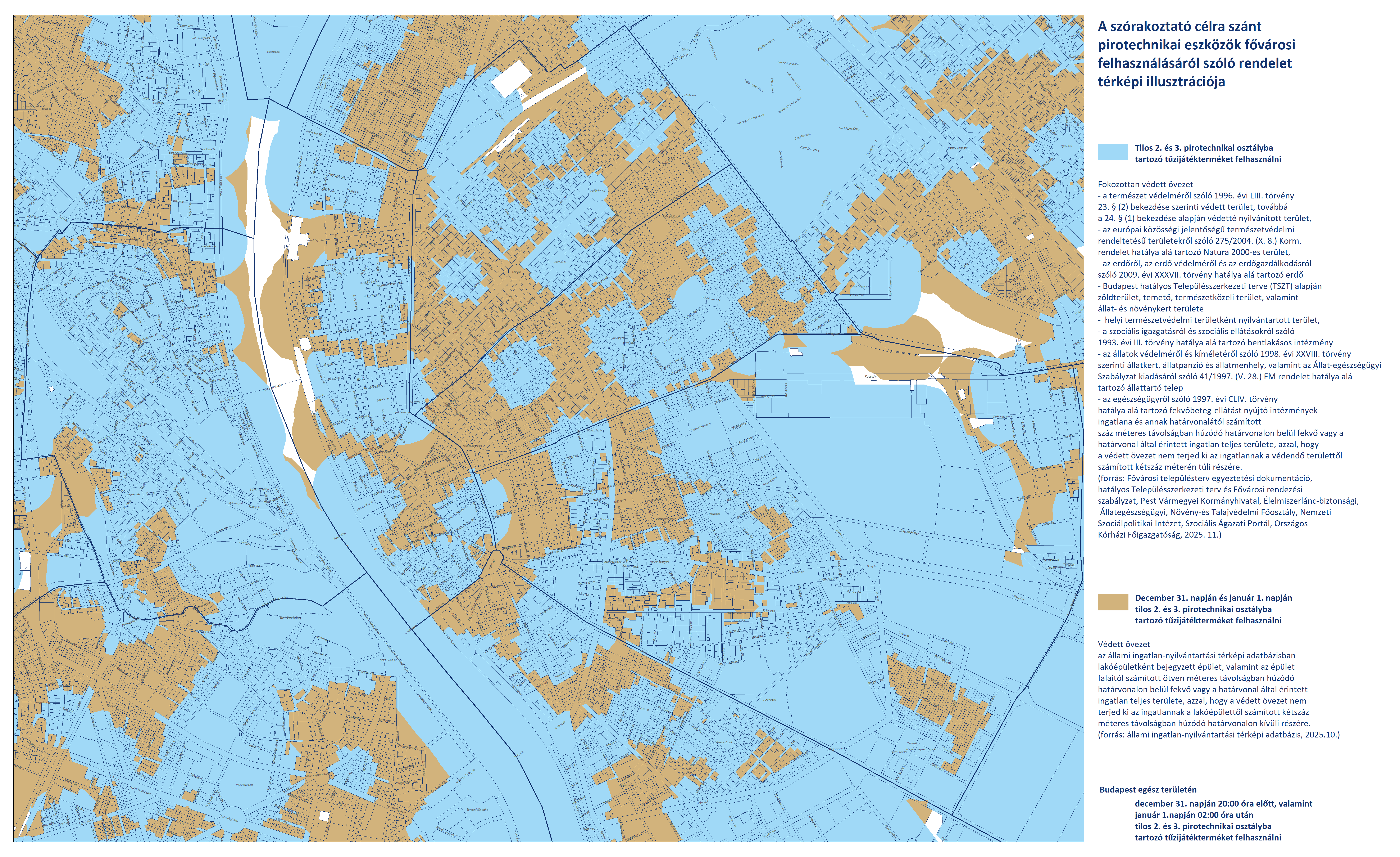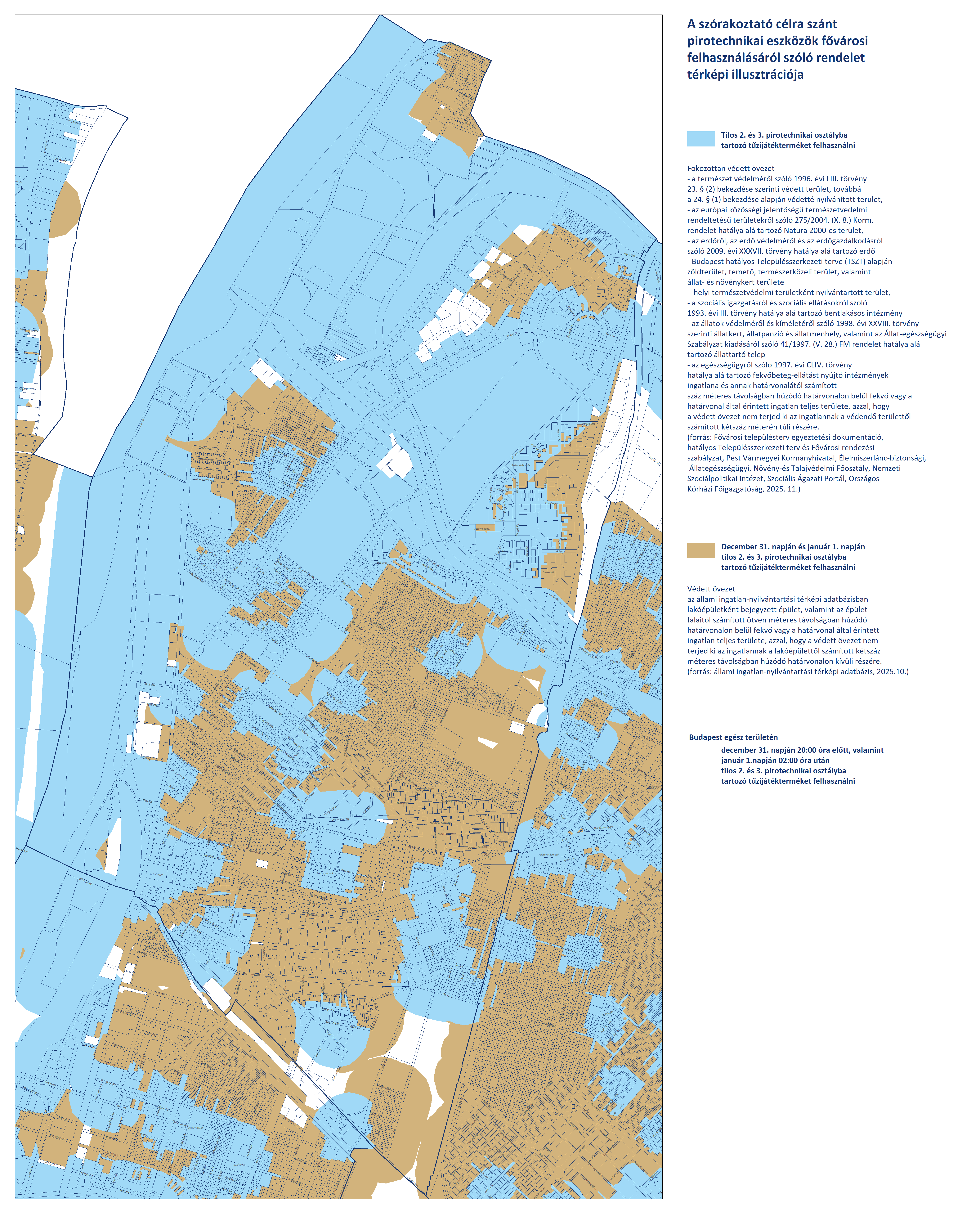 - Budapest területén, a fokozottan védett és védett övezeteken kívüli területeken (fehér színnel jelölve) a 2. és 3. kategóriájú pirotechnikai eszközök használata december 31-én 20:00-tól január 1-én 02:00-ig engedélyezett.