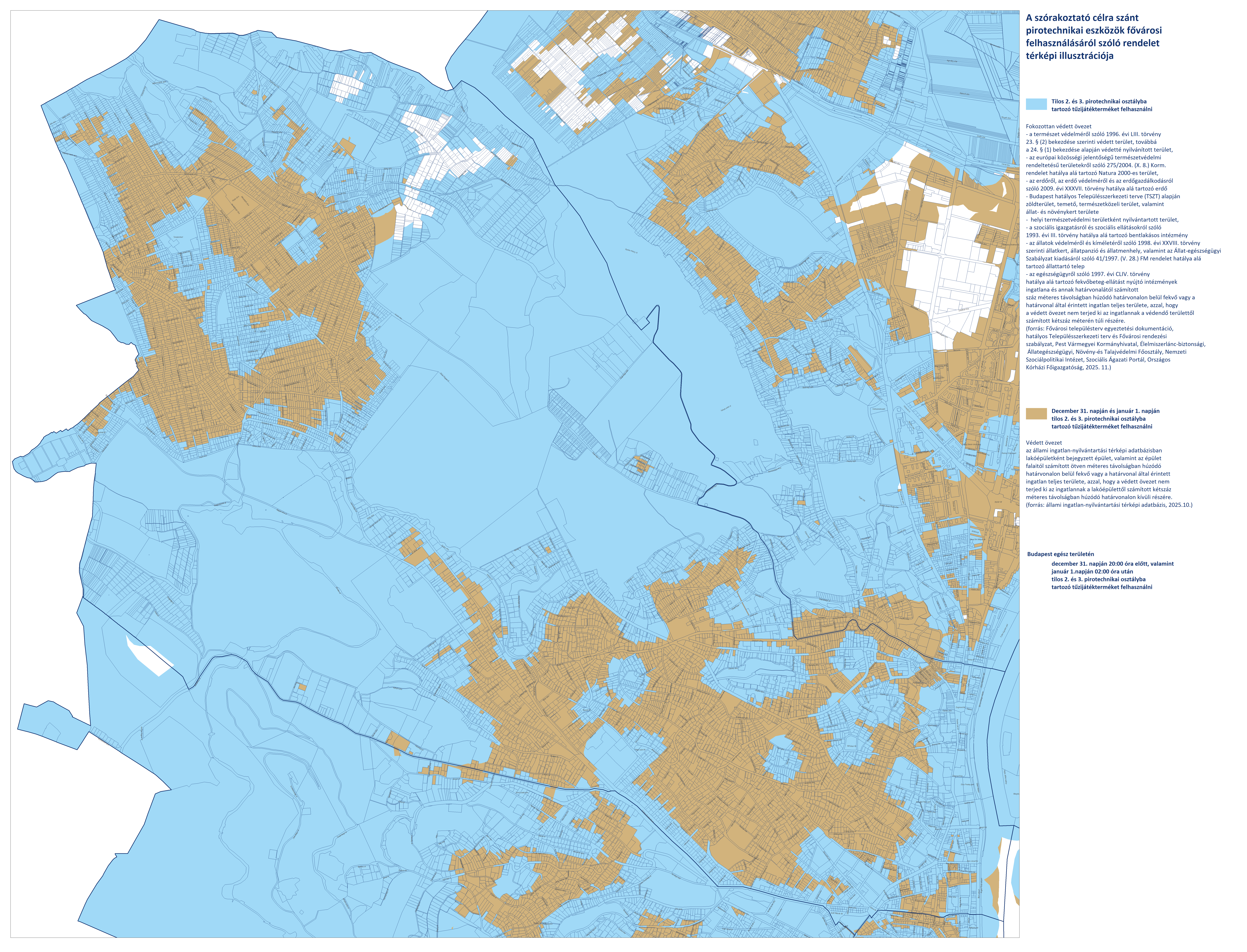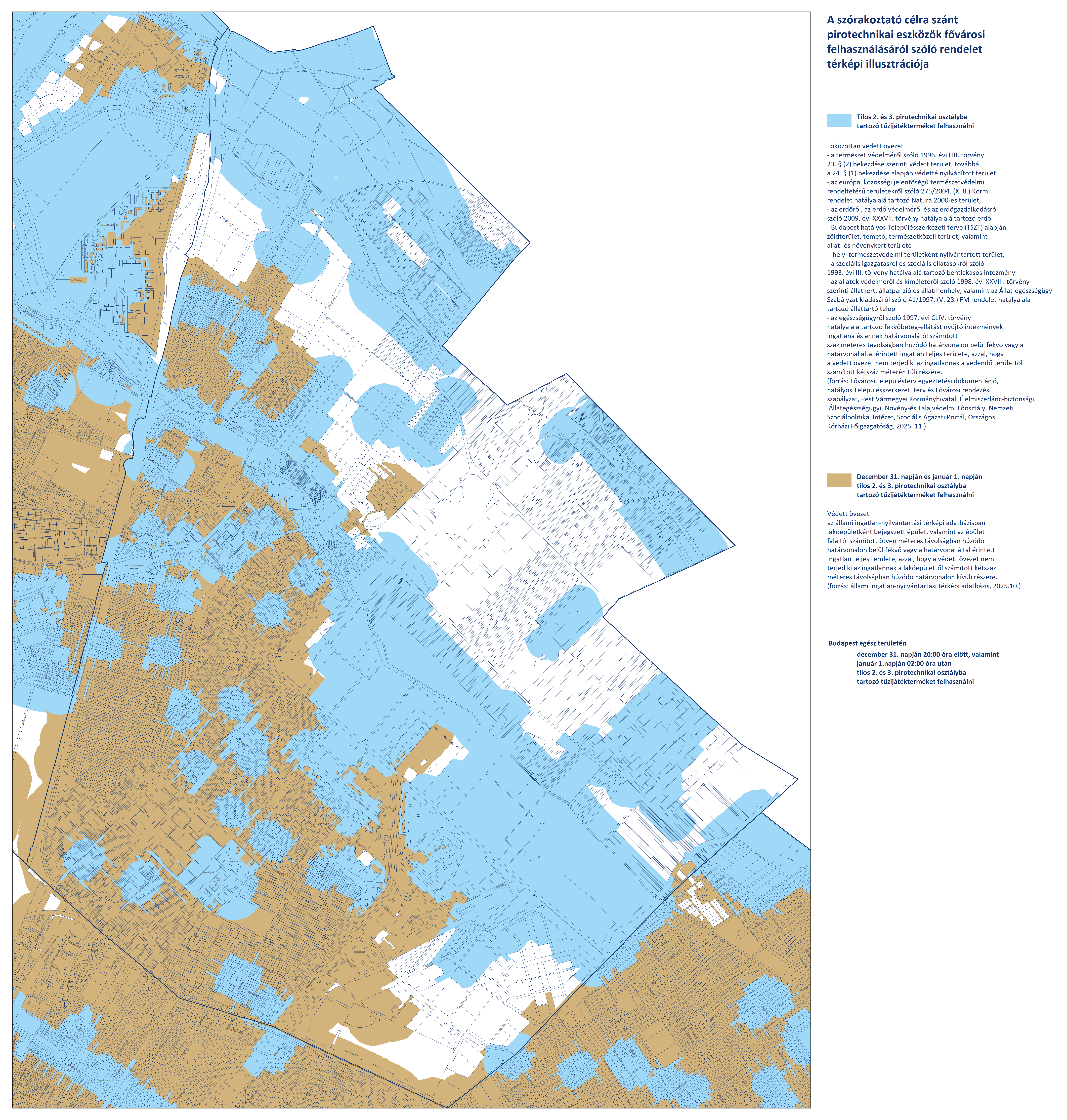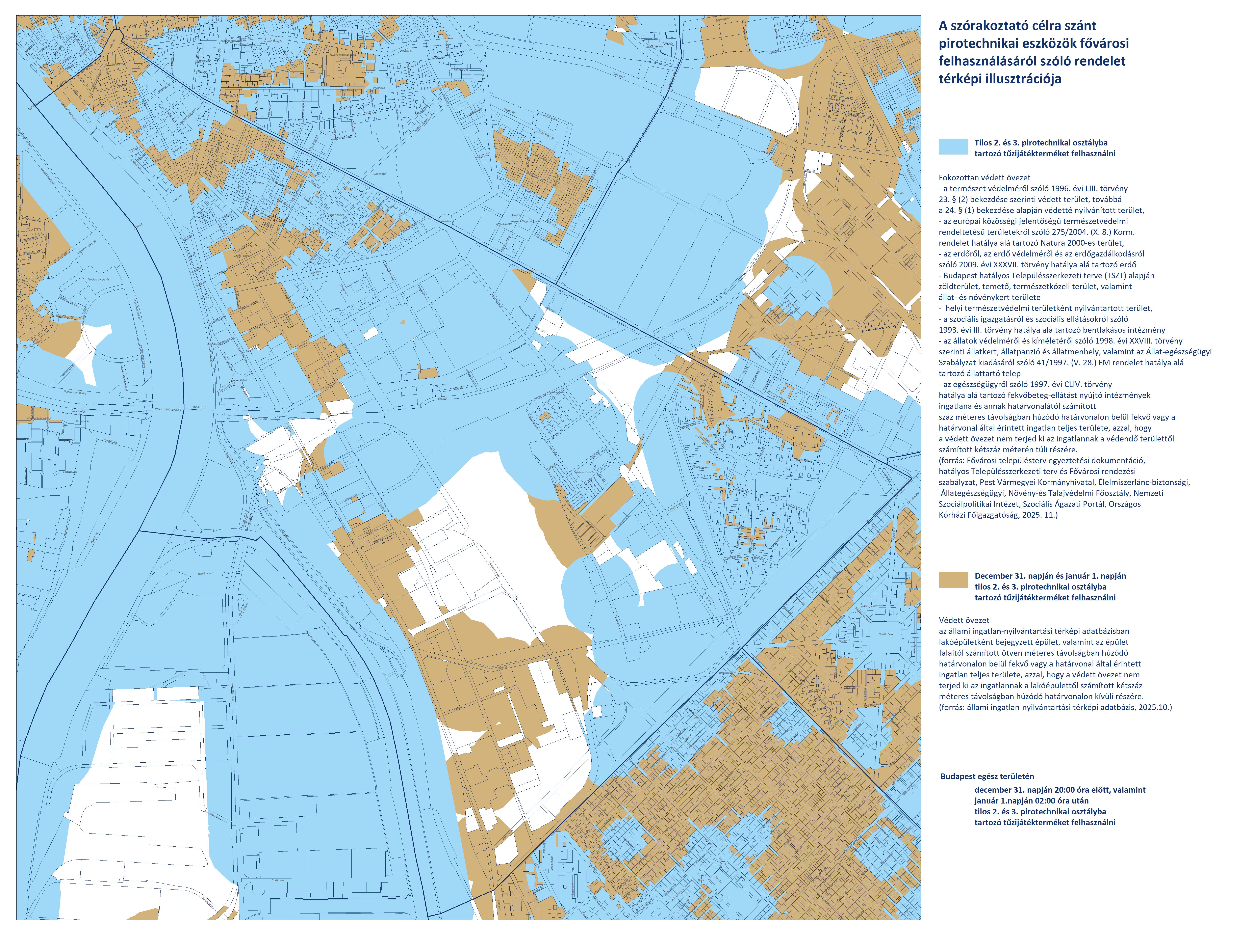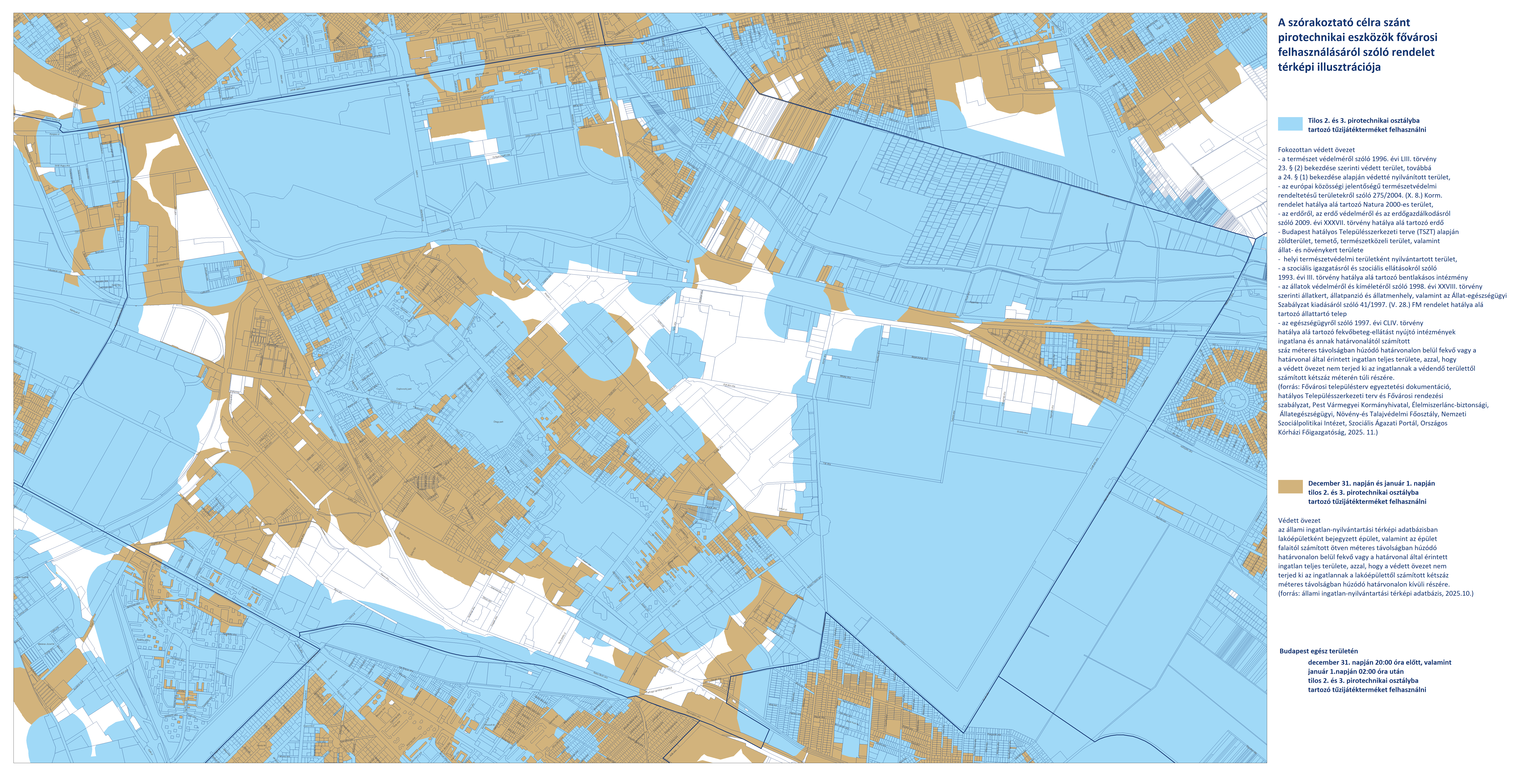 - Budapest területén, a fokozottan védett és védett övezeteken kívüli területeken (fehér színnel jelölve) a 2. és 3. kategóriájú pirotechnikai eszközök használata december 31-én 20:00-tól január 1-én 02:00-ig engedélyezett.