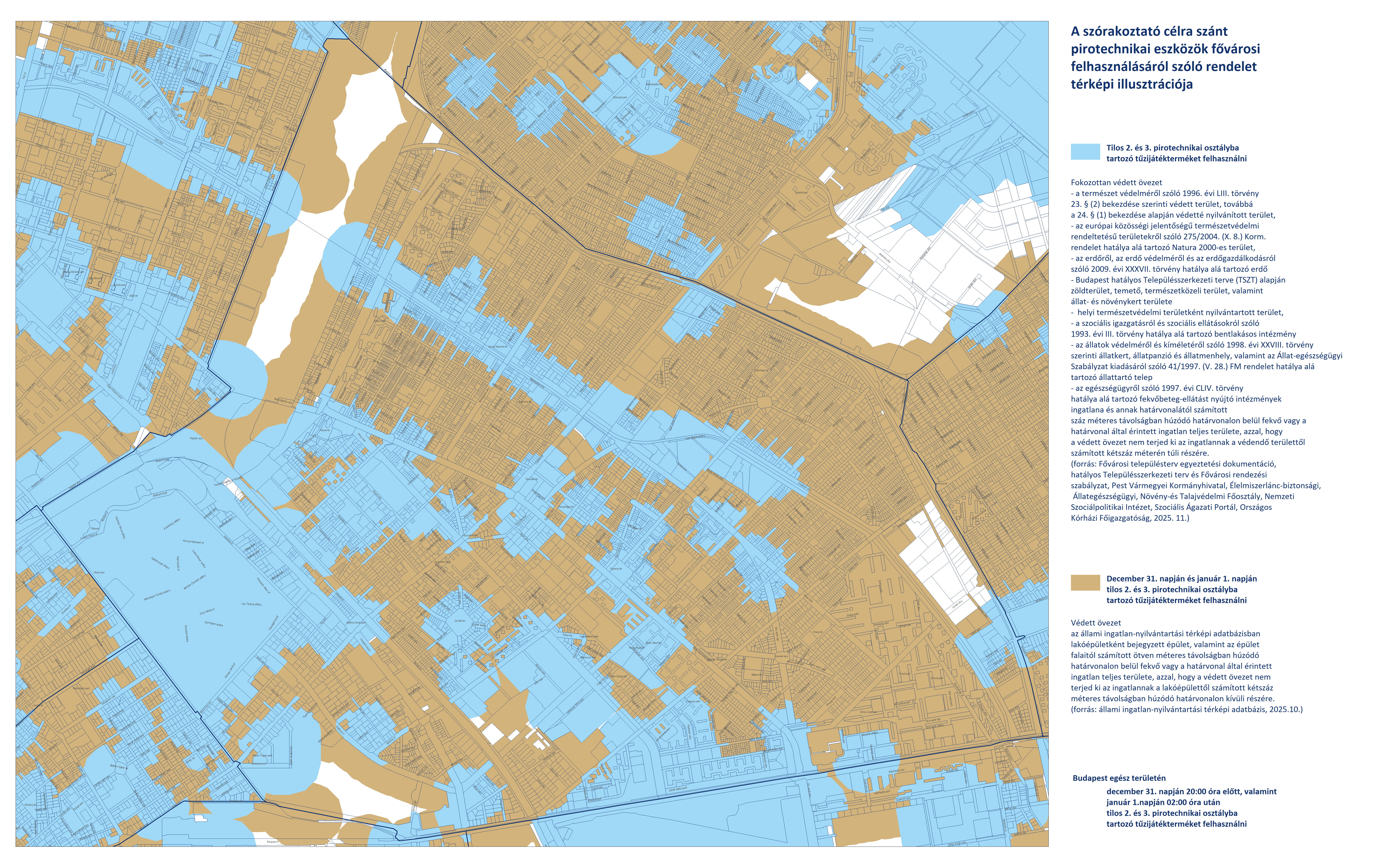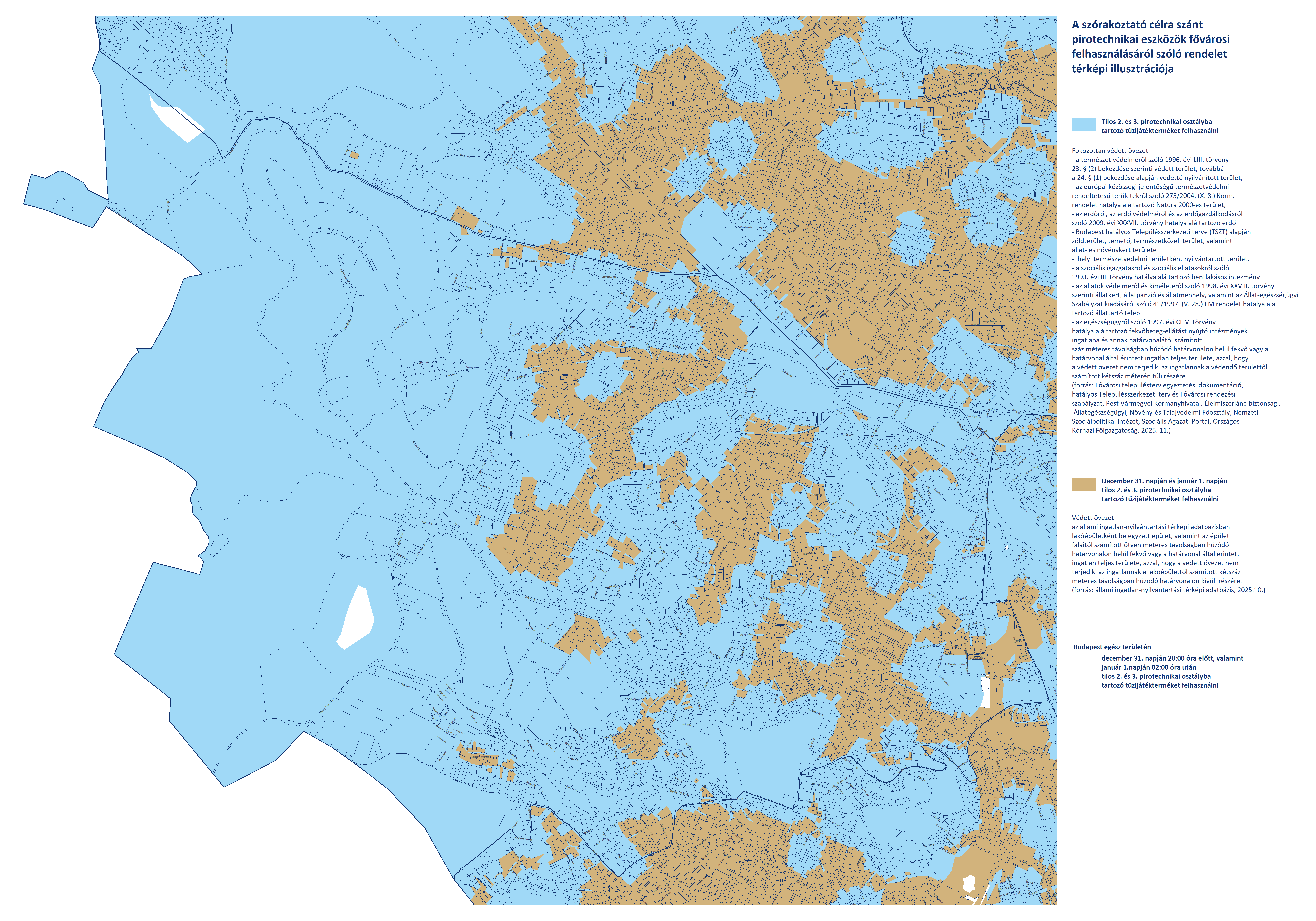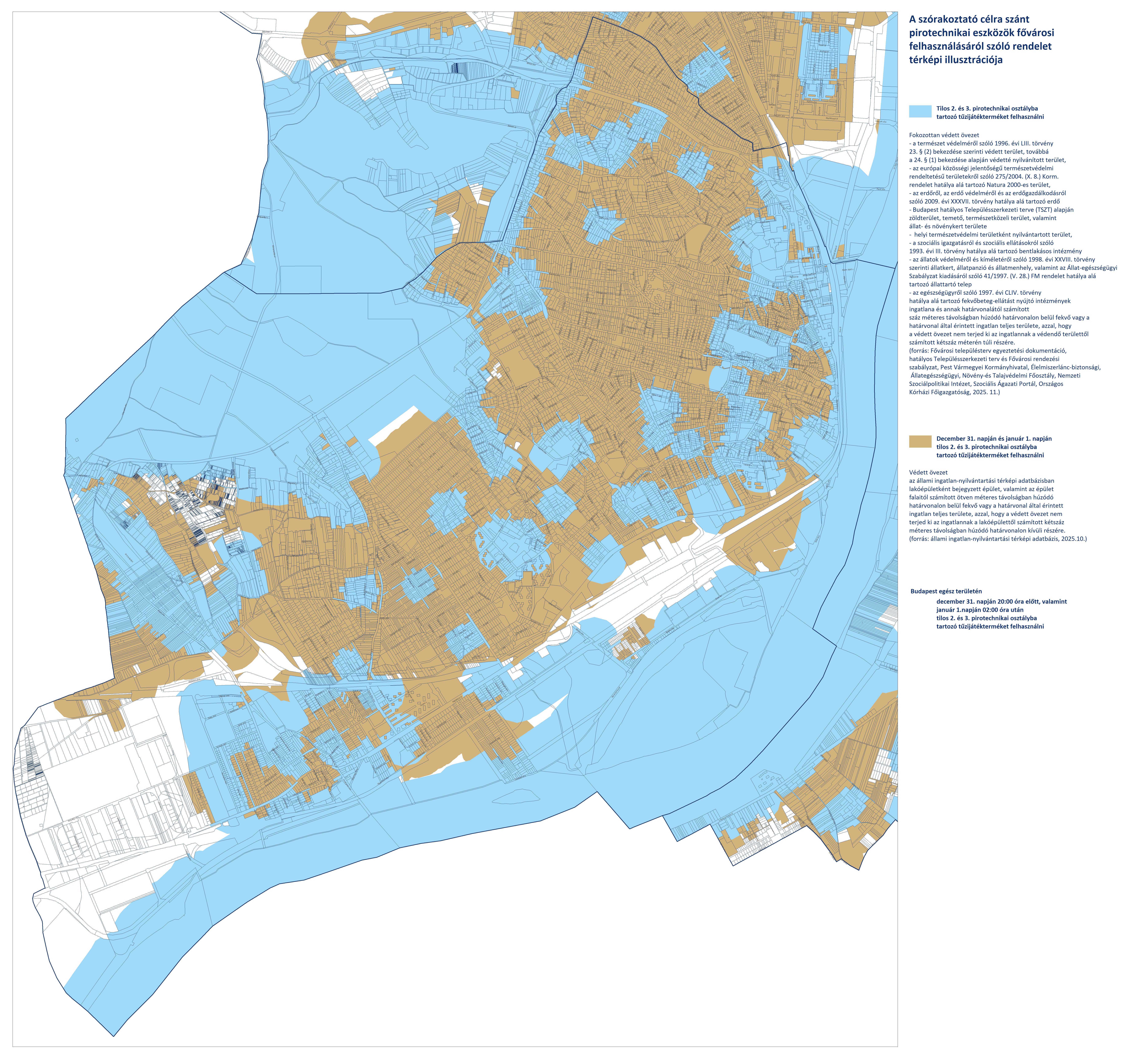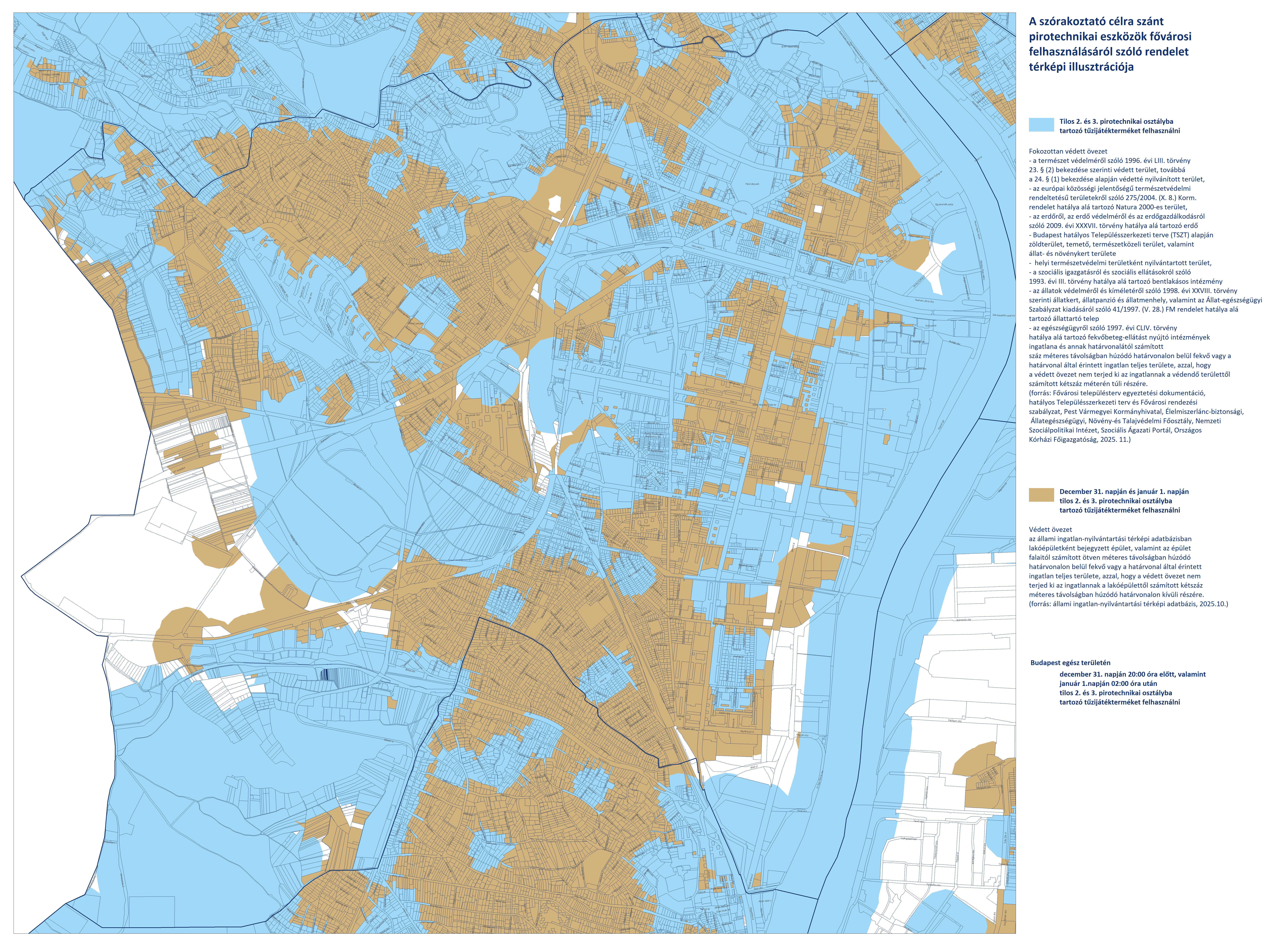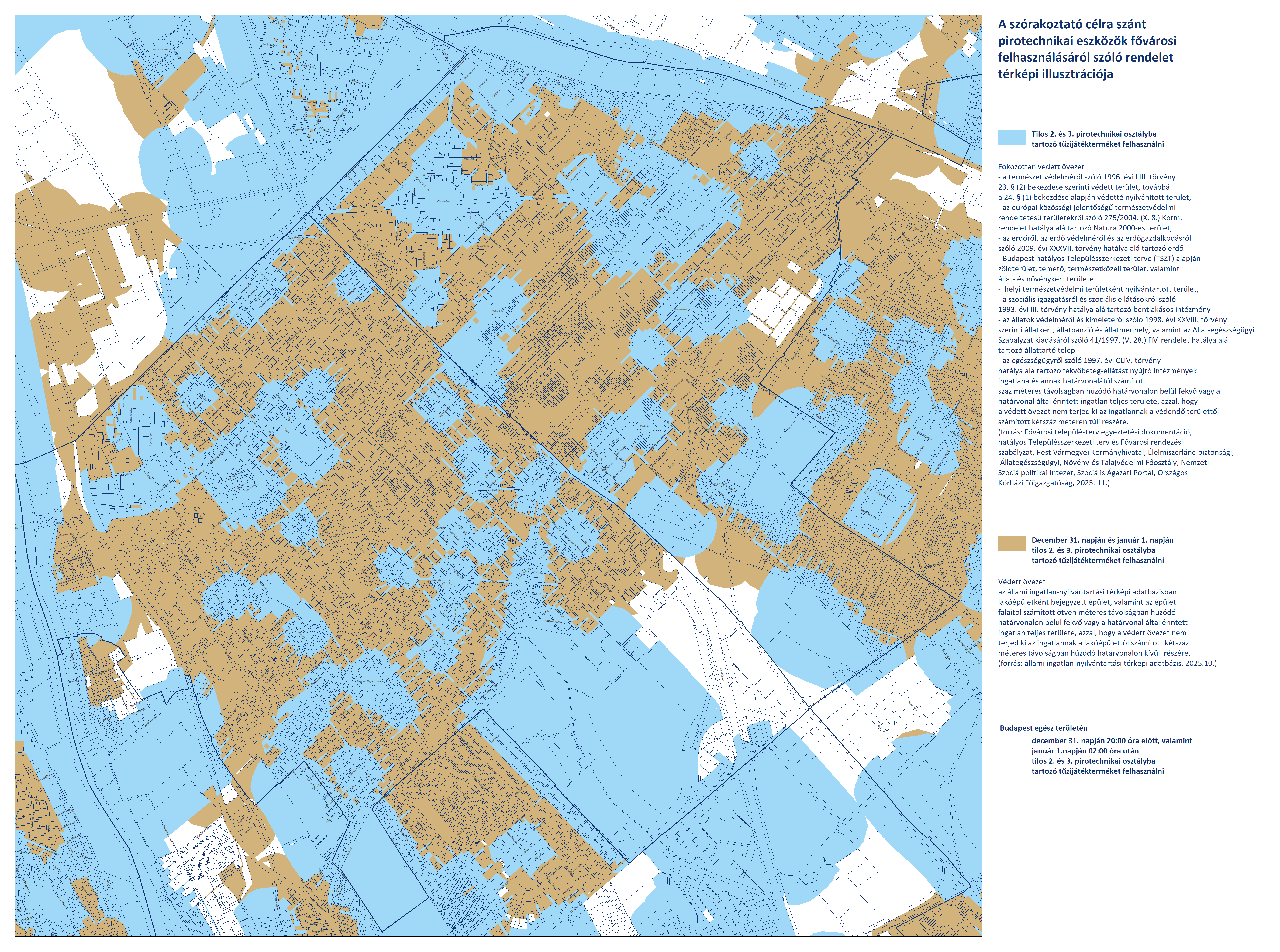 - Budapest területén, a fokozottan védett és védett övezeteken kívüli területeken (fehér színnel jelölve) a 2. és 3. kategóriájú pirotechnikai eszközök használata december 31-én 20:00-tól január 1-én 02:00-ig engedélyezett.