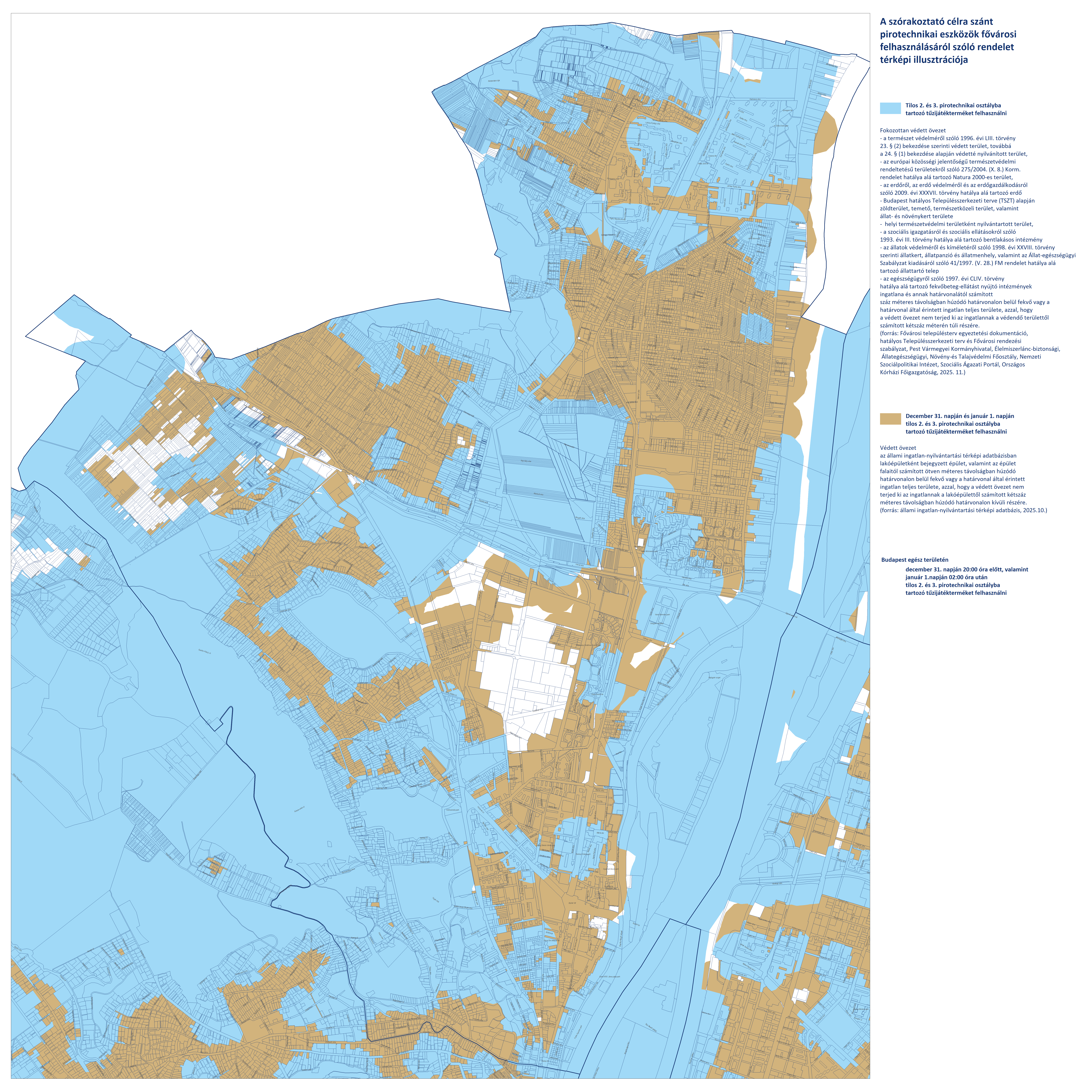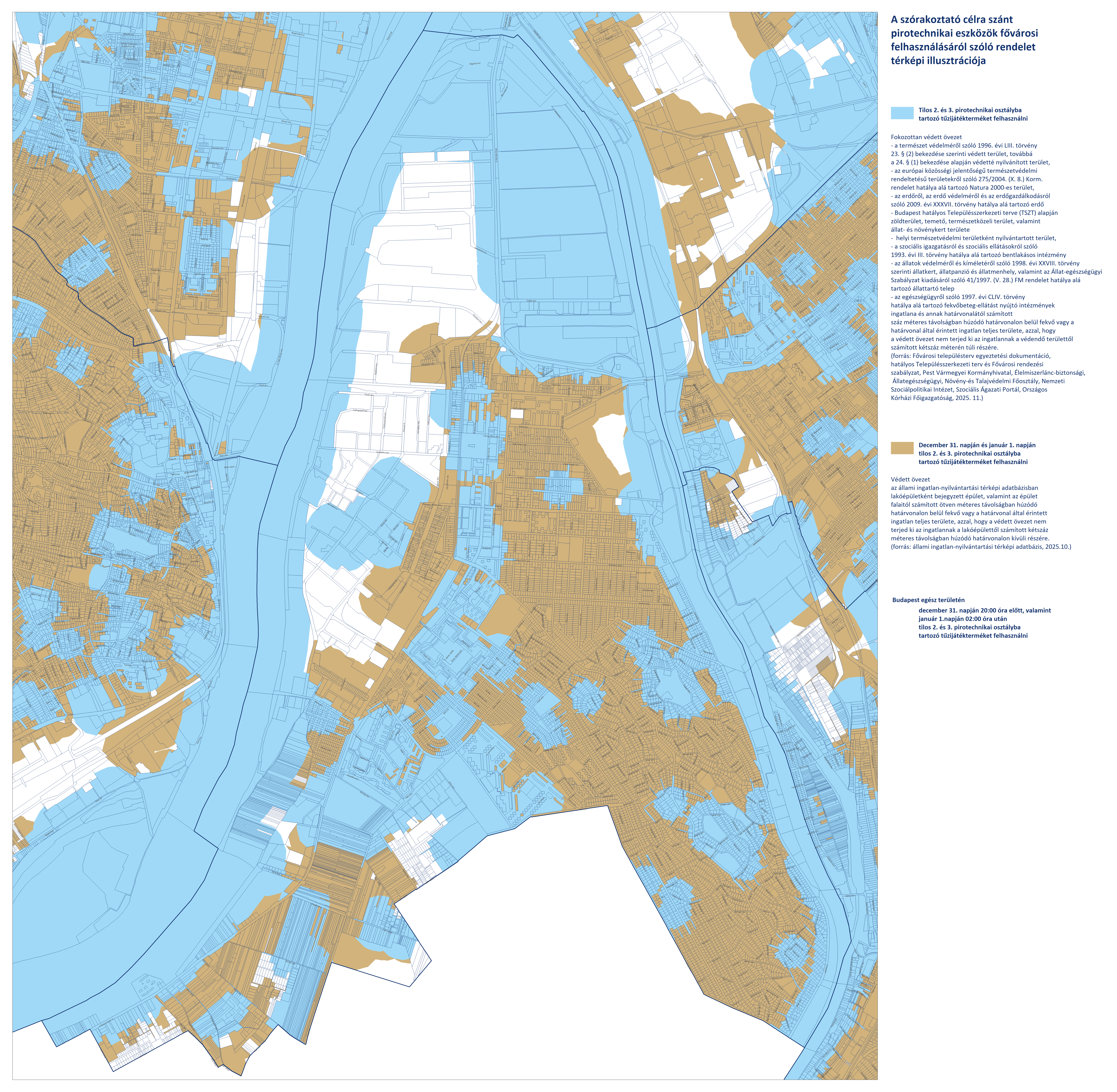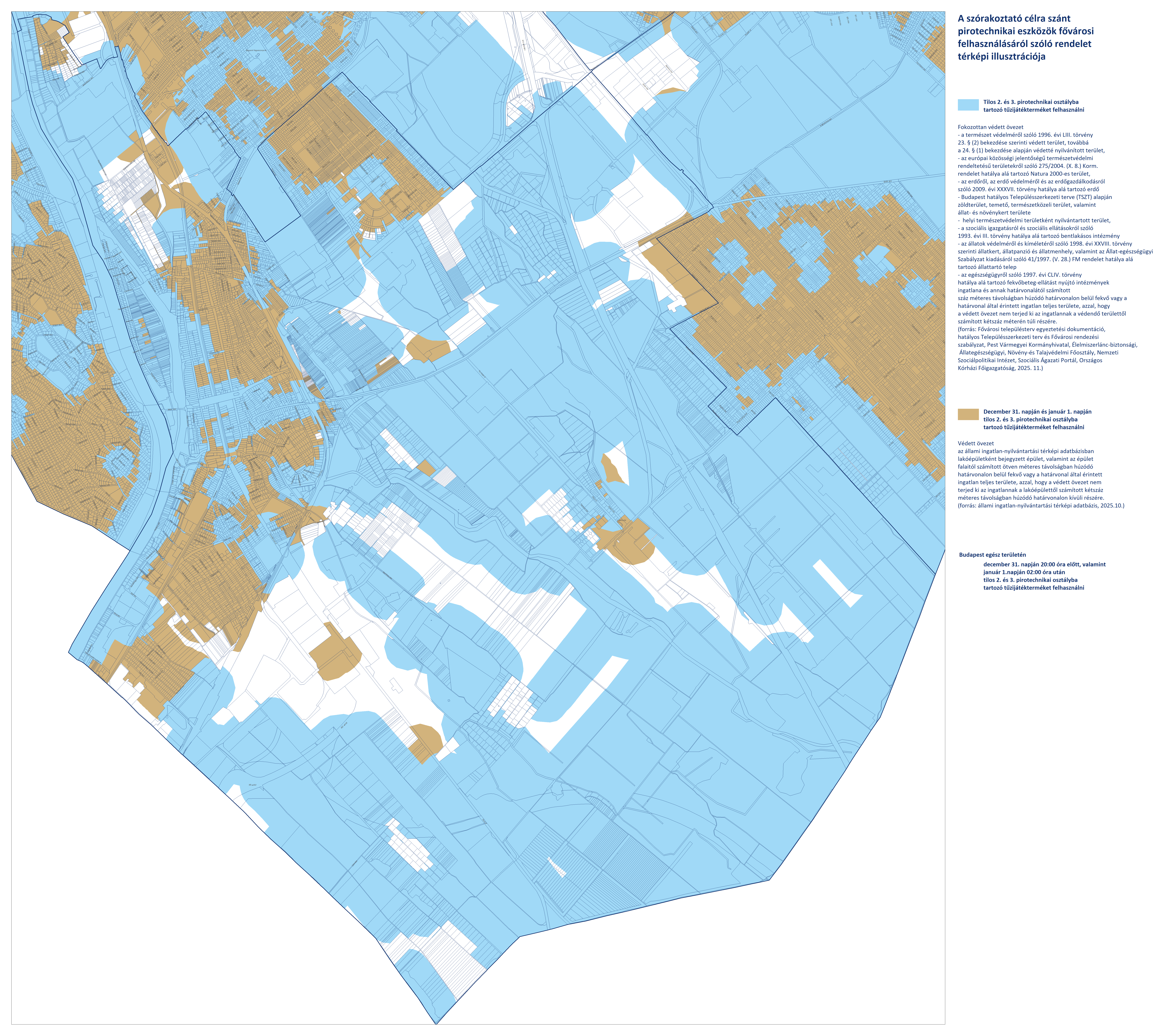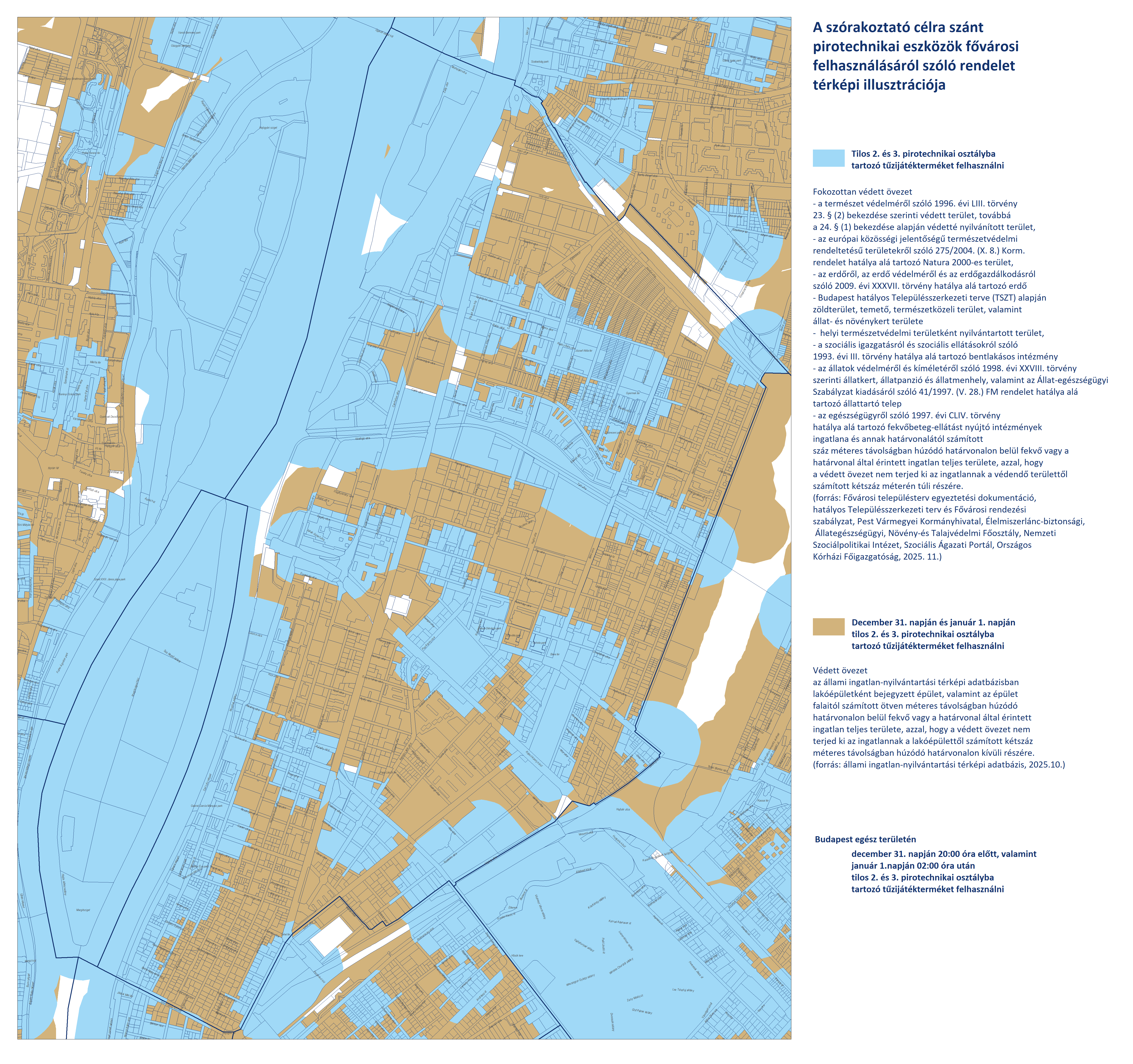 - Budapest területén, a fokozottan védett és védett övezeteken kívüli területeken (fehér színnel jelölve) a 2. és 3. kategóriájú pirotechnikai eszközök használata december 31-én 20:00-tól január 1-én 02:00-ig engedélyezett.